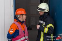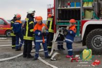 Auf einem ortsansässigen Firmengelände ist in einer Halle ein Brand ausgebrochen, in der Personen vermisst worden. Auf dem Gelände angekommen, kümmerte sich eine Gruppe um die Personensuche in der Halle. Eine weitere Gruppe begann mit der Brandbekämpfung von außen.